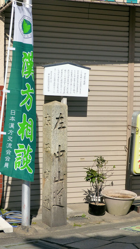 江戸時代中期、1750年ごろの道標。正面には、左中山道。右側の面には、右きふ(婦)道、って、あるね。