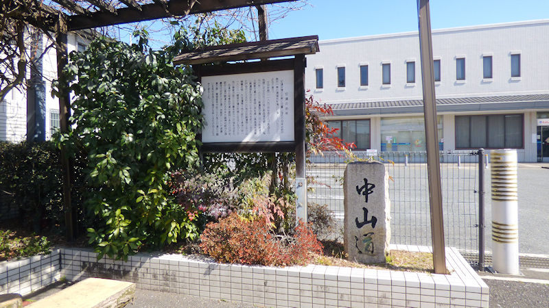写真の新道と旧街道の分かれ道、間の宿の入り口に、ジャボなカエルさんと、案内板がありました。それによると…。