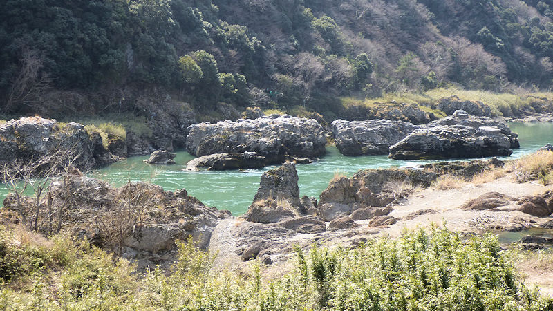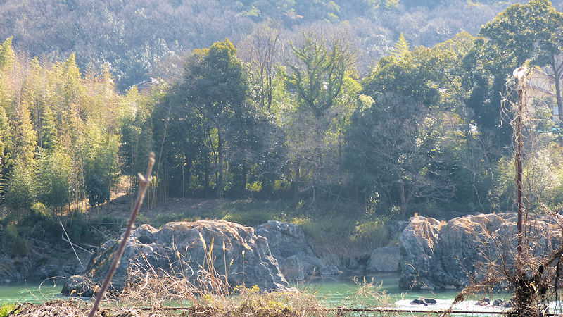 木曽川を、見てる方向とは逆に遡って、支流の可児川に入って少しのとこ、土田(どだ)って言う所の、川の中洲の島が鬼ヶ島。「すごいね。ここ。」