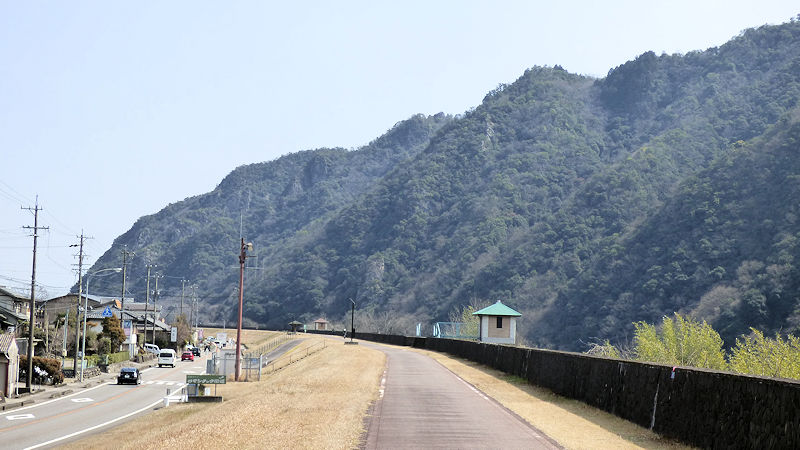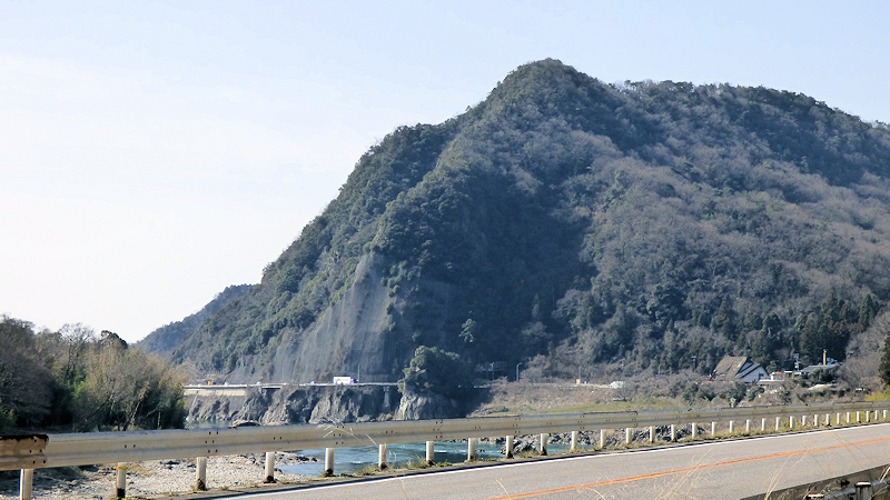 今、立っているのは、坂祝町の街が広がっている木曽川右岸の堤防上の中山道。対岸は、平野部分が全くなく、川から、いきなりの急峻な山。さらに、ところどころ、木々から岩が、そそり立っている。「まるで、何かの守護神。」