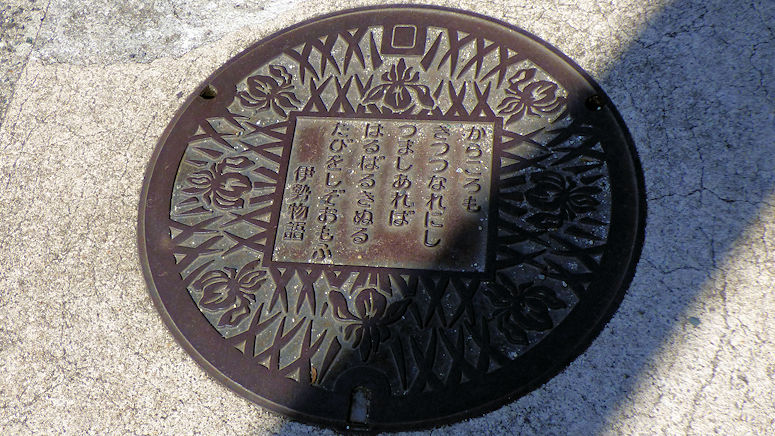 「ほう〜、歌が、書いてあるね。」マンホールって、様々なデザインがあるけど、歌を添えているところが、文化的厚みを漂わせているね。