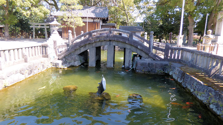 このことが、あってから、この池の水で目を洗うと、目の病が治ると信仰を集めたとか。「あ〜、太鼓橋の左側に、池へ降りる階段みたいなのがあるけど、そのため、かな?」