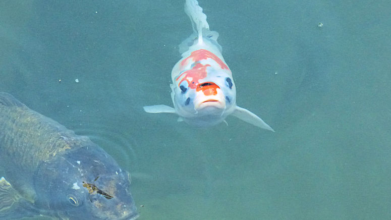 向こうから、鯉くんが、やってきたね。餌をくれる人かどうか、見ているのかな?