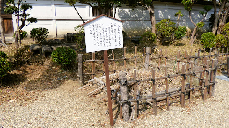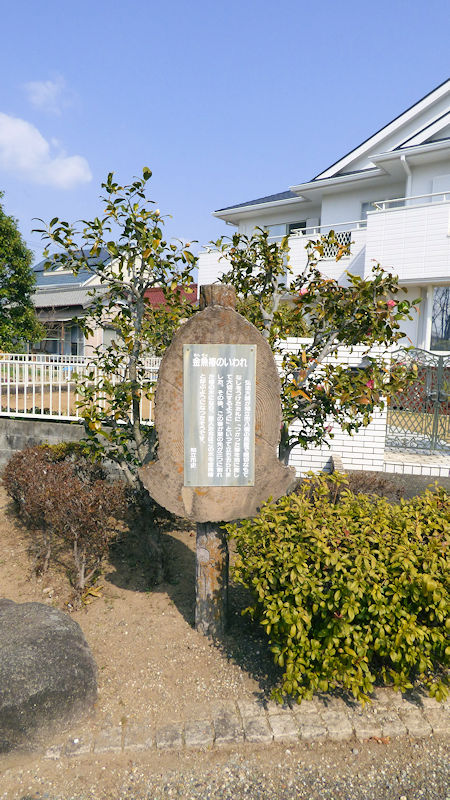 昔、弘法大師が、ここ、八橋に来られた時に、民家で親切なもてなしを受けたお礼に、使った箸を、地面にさして大切にするようにと言って、去っていかれた。その箸が、金魚椿に成長したそうな。