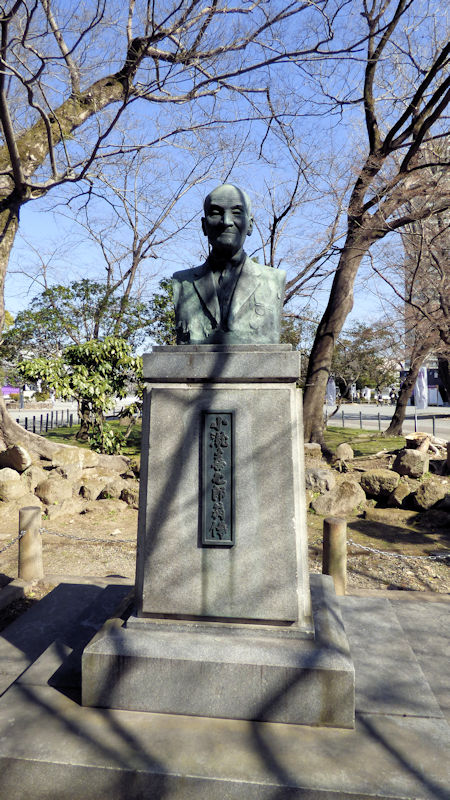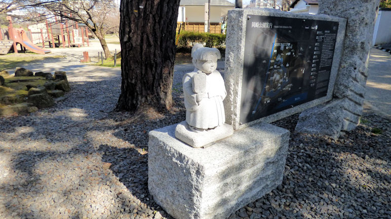 この方は、小瀧(おだき)喜七郎翁。四代目の岡崎市長さんだそうな。「そうなんだ。」 岡崎城を含む、この岡崎公園の改築・改修に力を注がれ、定期的に公園を巡回して、一木一草の手入れにまで、気を配られたことから、公園市長…と、呼ばれていたそうな。「ニックネームで呼ばれていたなんて、市民から愛されていたのかな?」