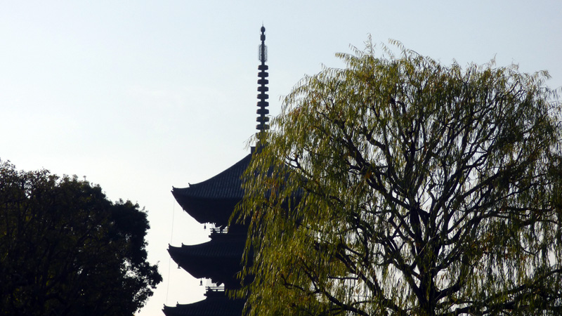 東寺の 五重塔。江戸時代に、南の方に、傾いたことが、あったらしい。「とんでもない事件だね。解体、組み直し? でも、危ないよね。」