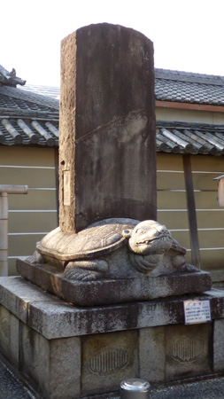 贔屓:ぱっと見は、ほとんど亀、その上に立っているのは、仏頂尊勝陀羅尼の碑。よく見ると、石の中央に、渦巻き状に何か書いてある。「こんなの初めて見た。どうやってというか、どっちから読むの? って、これ、何の文字?」