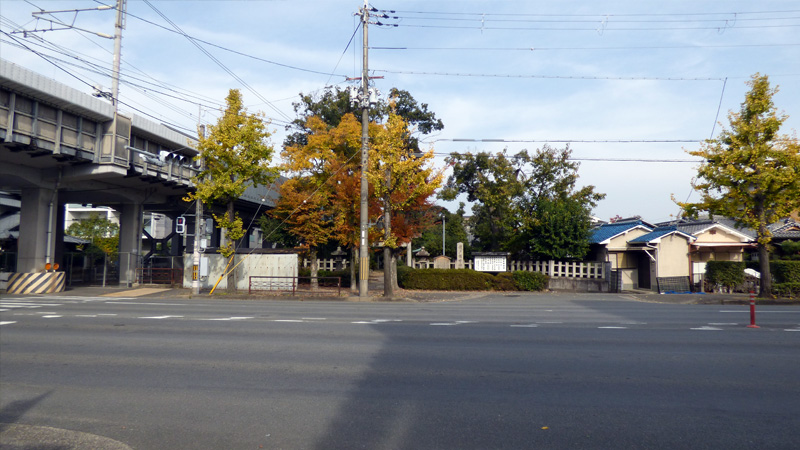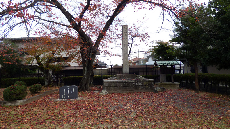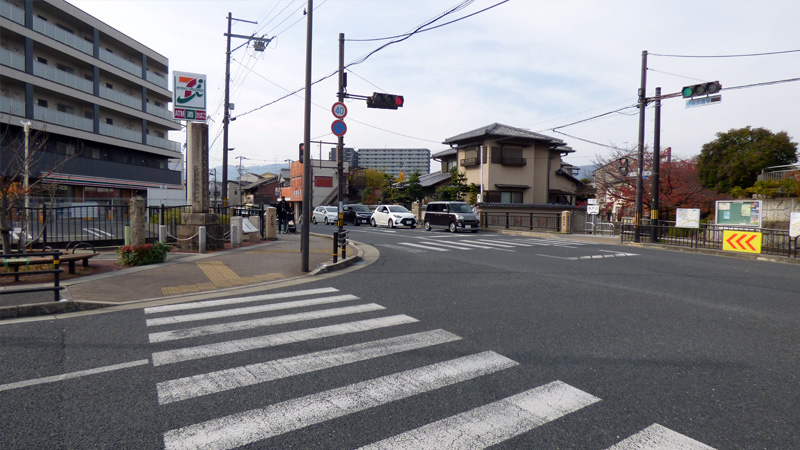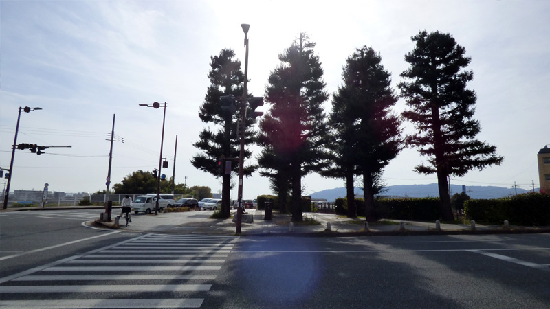 先の写真、左右の道が九条通り。渡ると、上の写真。お堂脇の後ろに木があるけど、そのもひとつ奥の石柱が、羅城門跡の碑。「羅城門は、倒壊して再建されずって聞いたけど、朱雀大路は?」