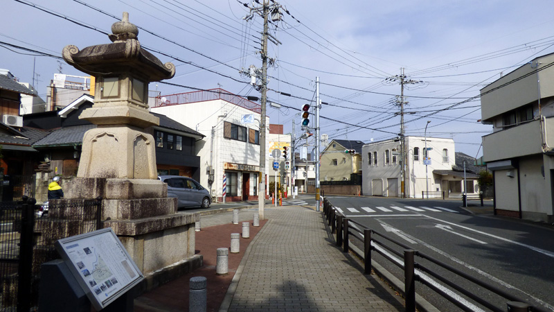 手前の大きい西国街道の石碑は、新しいものだけど、奥の角に立つ常夜灯は、江戸時代の天保期に、伊勢参りの講、築榊講によって建てられたもの。