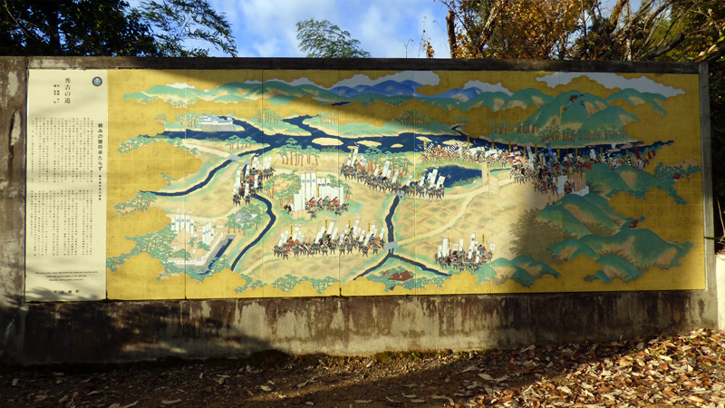 天王山、山腹の陶板絵。『秀吉の道』というタイトルで、何枚か陶板絵が設置されているんだね。この写真の絵は合戦前の先の絵の次、まさに戦っているシーンが描かれている陶板の中で、明智光秀本陣の部分。