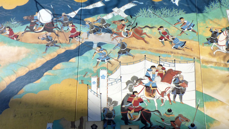 写真では、光秀本陣の上を、丸に二つ雁金紋の柴田勝定が逃げていくのが描かれているね。