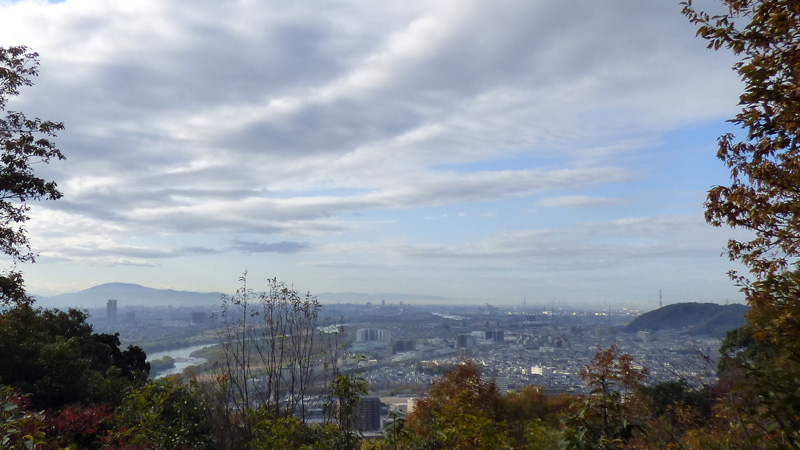 天王山の上からの眺め。大阪平野の方向。中央を蛇行しているのが淀川。左上の山は生駒の山系。中央の遠くに見えるのは、泉州の山並みだろうか。右の方で、デコボコしているのは、大阪市内のビル群。