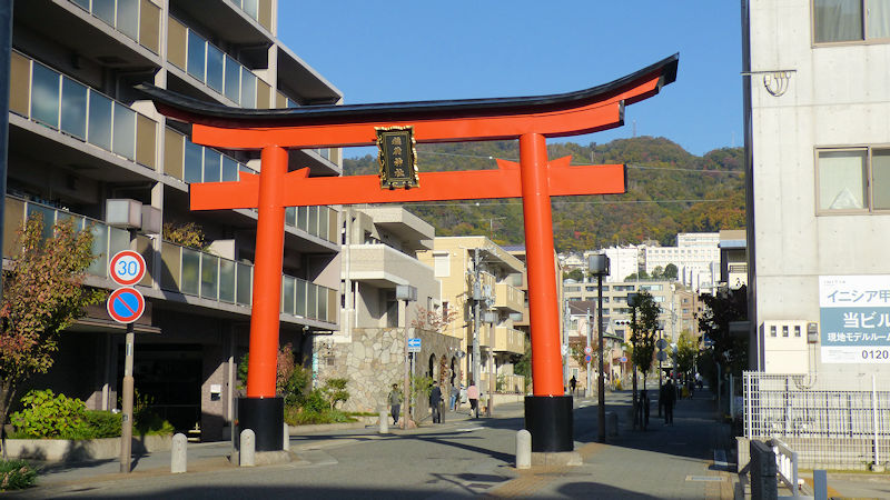 旧街道沿いに、一ノ鳥居があってというのは、幾つか見てきたけど、ここは、すごいね。「前は、四車線の国道2号線。しかも、高いビルに囲まれてね。」