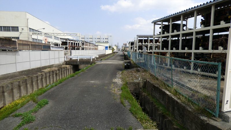 右も左も工場というか、事業所というか、しかも、裏側の道みたいで、寂しい限りだね。「さっき、区画整理の碑があったから、ひょっとして、この道自体も、新しい道?」