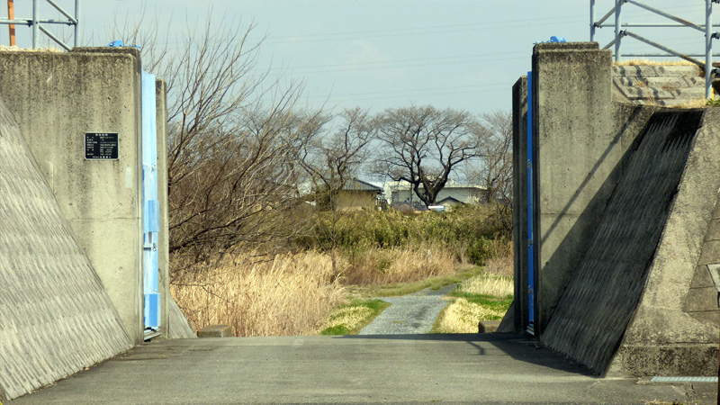 街道をまっすぐ行くと、堤防に突き当たると思いきや、堤防が、切れてるね。「でも、川の水量が増えて来たら、水色にペンキ塗ってある部分が動いて、堤防が閉じられるんだろうね。」