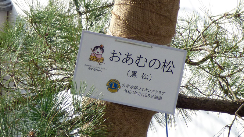 おあむの松の看板に、キャラクターが、描かれているね。ひょっとして…。「大垣市マスコットキャラクター、おあむちゃん、って、書いてあるよ。」