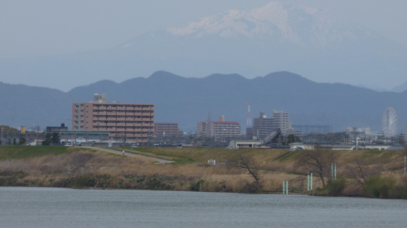 地元の人にとっては、何でもない景色だけど…、いや〜、いいね、春なのに、雪をいただいてる山。「住んでるところには、そういう景色、無いからね。」