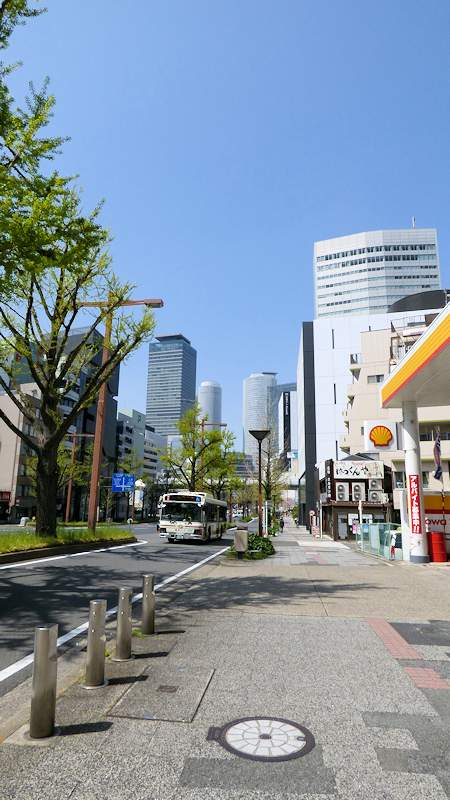 古い街並みの残る旧街道から、広い道、桜通に出ると、ビックリ、高層ビル群!「まぁ、広い道も、高層ビルも、珍しくはないけど、歩いてきた道とのギャップが、すごいね。」
