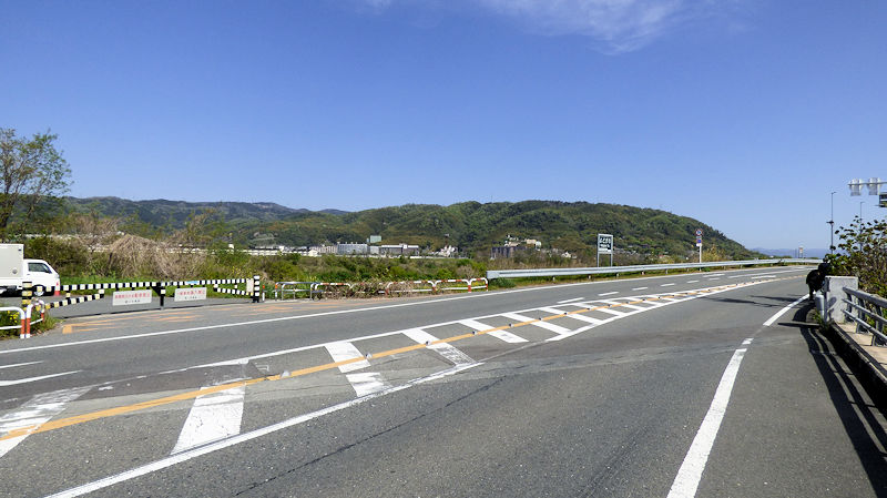 手前の道路の向こうは、淀川。ほぼほぼ、この辺りで、桂川、宇治川、木津川が合流しているんだと思う。「広大だね。」